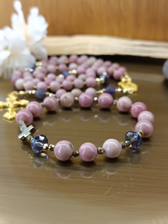 Bransoletka-różaniec na rękę, z naturalnego rodonitu i kryształka. Wykończona złotym krzyżykiem z hematytu. Symbol wiary, energii i światła.