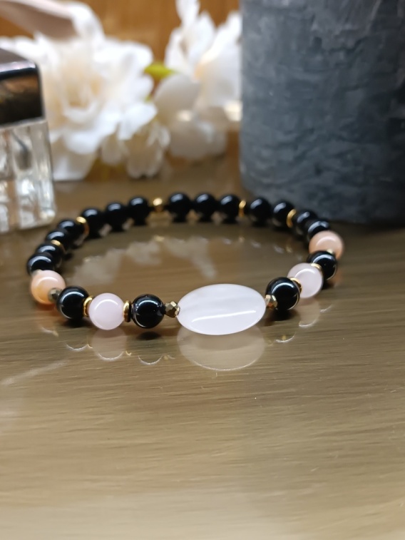 Czarna Harmonia Bransoletka z czarnym turmalinem kwarcem różowym kamieniem słonecznym i hematytem