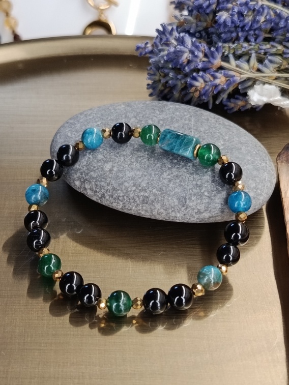 Ochrona, spokój i jasność myśli. Niebieska Ochrona to bransoletka, która łączy siłę czarnego turmalinu z kojącą energią apatytu i stabilnością agatu, tworząc harmonijny talizman na co dzień.