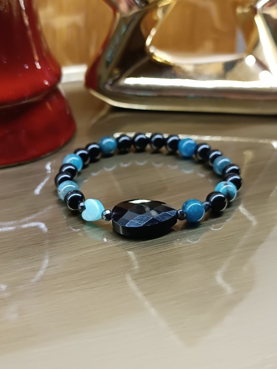 Bransoletka z naturalnych kamieni: czarny turmalin, agat, apatyt i hematyt. Połączenie ochrony, harmonii i klarowności myśli. Wykonana na elastycznej gumce, kamienie 6 mm.
